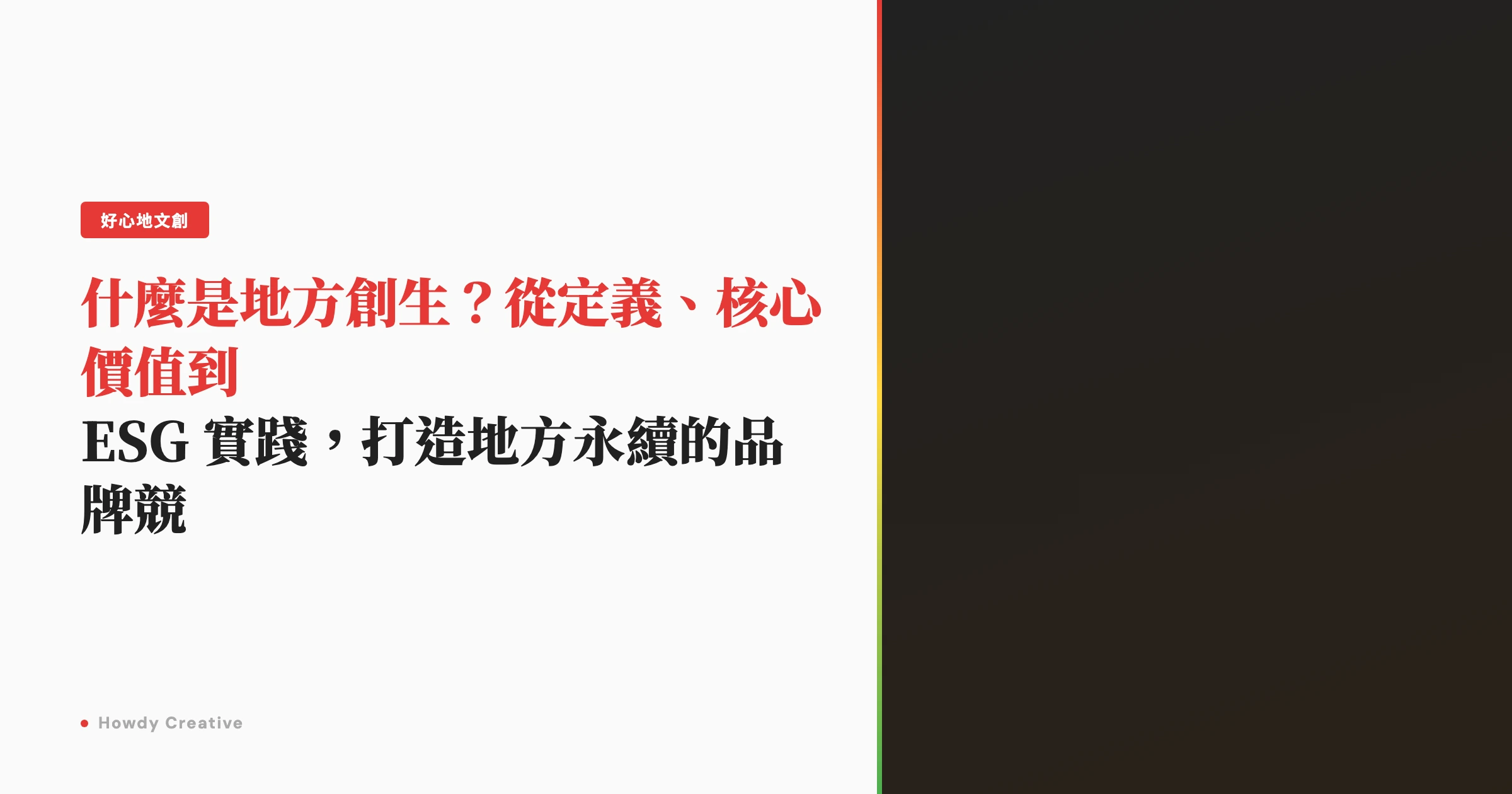 3. 跨域整合與企業 ESG 趨勢 現今地方創生常與企業 ESG(環境、社會、公司治理)結合。透過專業品牌策略的導入,企業能協助地方建立識別系統,吸引外部資源與觀光人潮,實現品牌與地方共好的雙贏局面。
